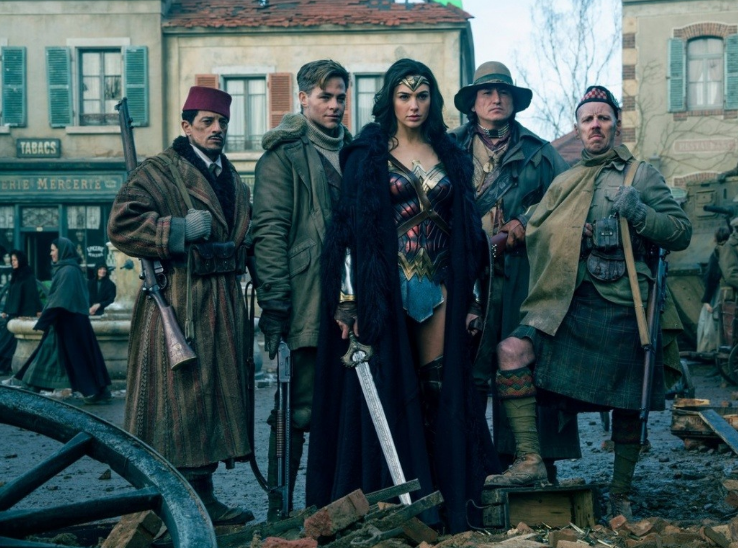 Ближнее окружение супергероини оказалось на удивление интересным. В первую очередь, речь идёт об офицере британской разведки Стиве Треворе (Крис Пайн), который и вывел прелестную амазонку в люди. Пайн ещё раз продемонстрировал, что без напускной дурашливости капитана из «Стар Трека» он смотрится гораздо выигрышнее. Настоящий лидер и командир, герой не хуже самой Дианы, но без суперспособностей. Зато настоящий командир и лидер. Не менее интересна и его команда: снайпер-шотландец (Юэн Бремнер) с посттравматическим синдромом, индеец-контрабандист (Юджин «Храбрый камень») и шпион-турок Самир (Саид Тагмауи). Характерные персонажи уникальные, с нешаблонными репликами и образом действий. Но не обошлось без «но» — создав интересные образы, мисс Дженкинс не озаботилась тем, чтобы их развить.
